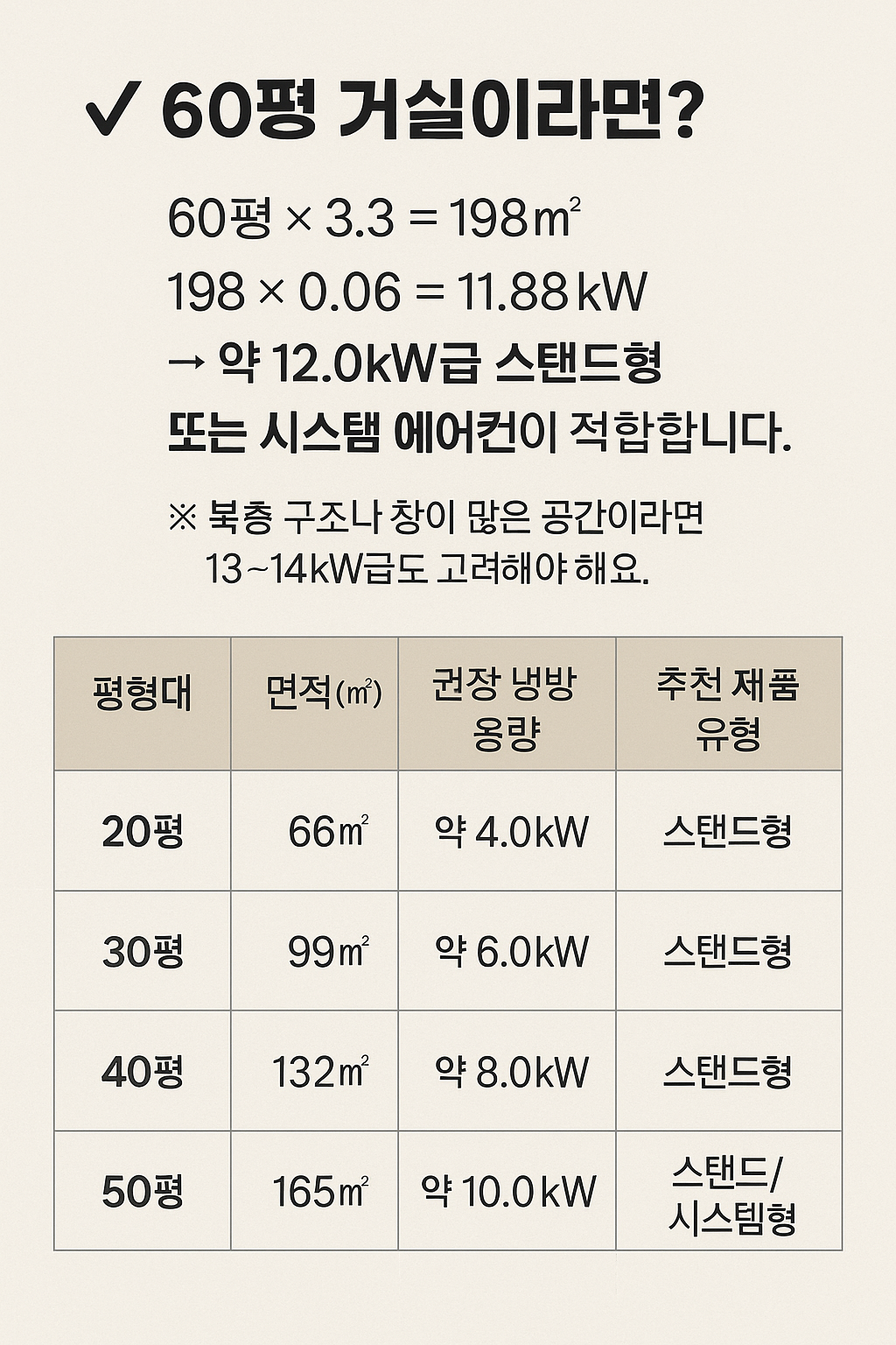 🧊 냉방능력(kW) = 실내 면적(㎡) × 0.06
