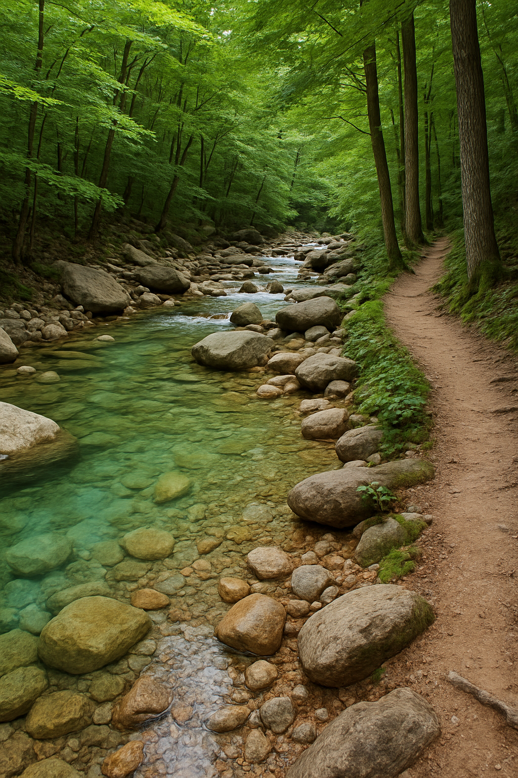 풍경: 숲속 트레킹길과 함께한 투명 계곡수