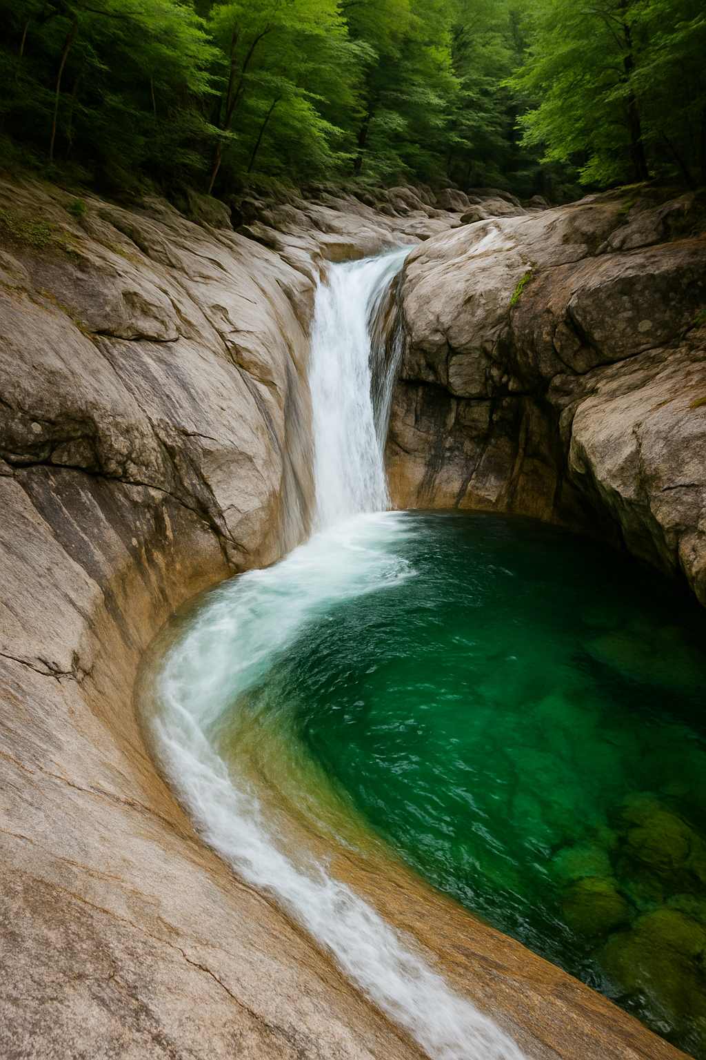 풍경: 암반 홈통 자연 워터슬라이드, 짙은 에메랄드 소(沼)