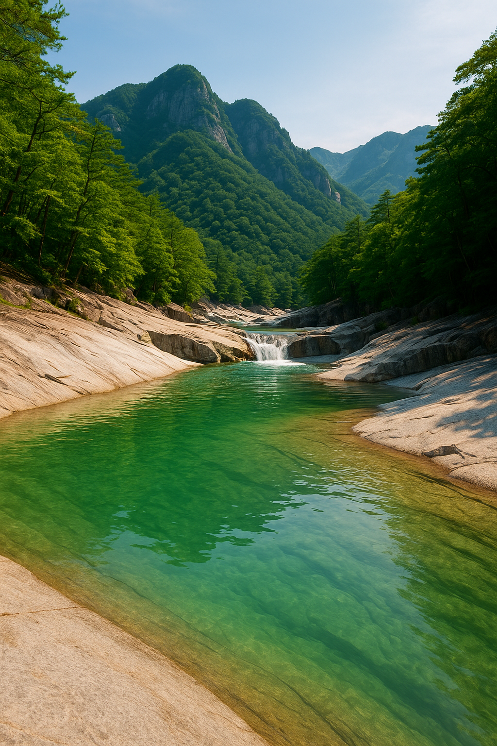 풍경: 10km 이어진 순수 암반 사이의 소폭포, 햇살 반짝이는 에메랄드빛 무릉반석